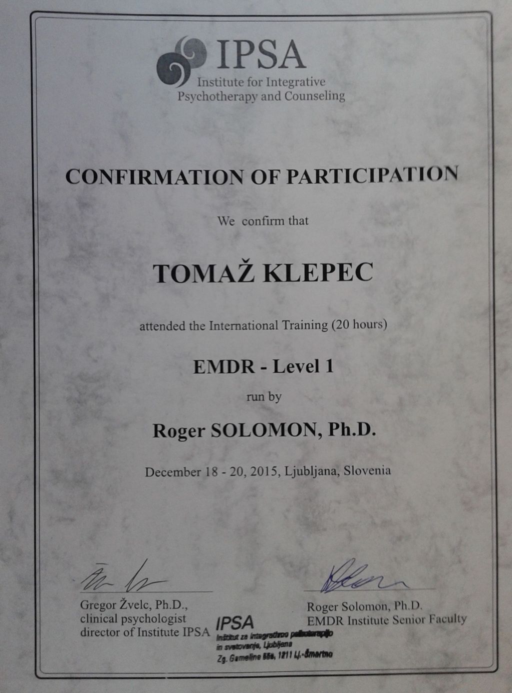 Leta 2011 sem na inštitutu za transakcijsko analizo IPTA ( Inštitut za psihoterapijo transakcijske analize) pridobil naziv specializant transakcijske analize. Redno se izobražujem na različnih področjih psihoterapije (priprava na izpit CTA, edukacijska TA, Relacijska TA, Družinska mediacija, EMDR prva stopnja, redne supervizije, osebna terapija).